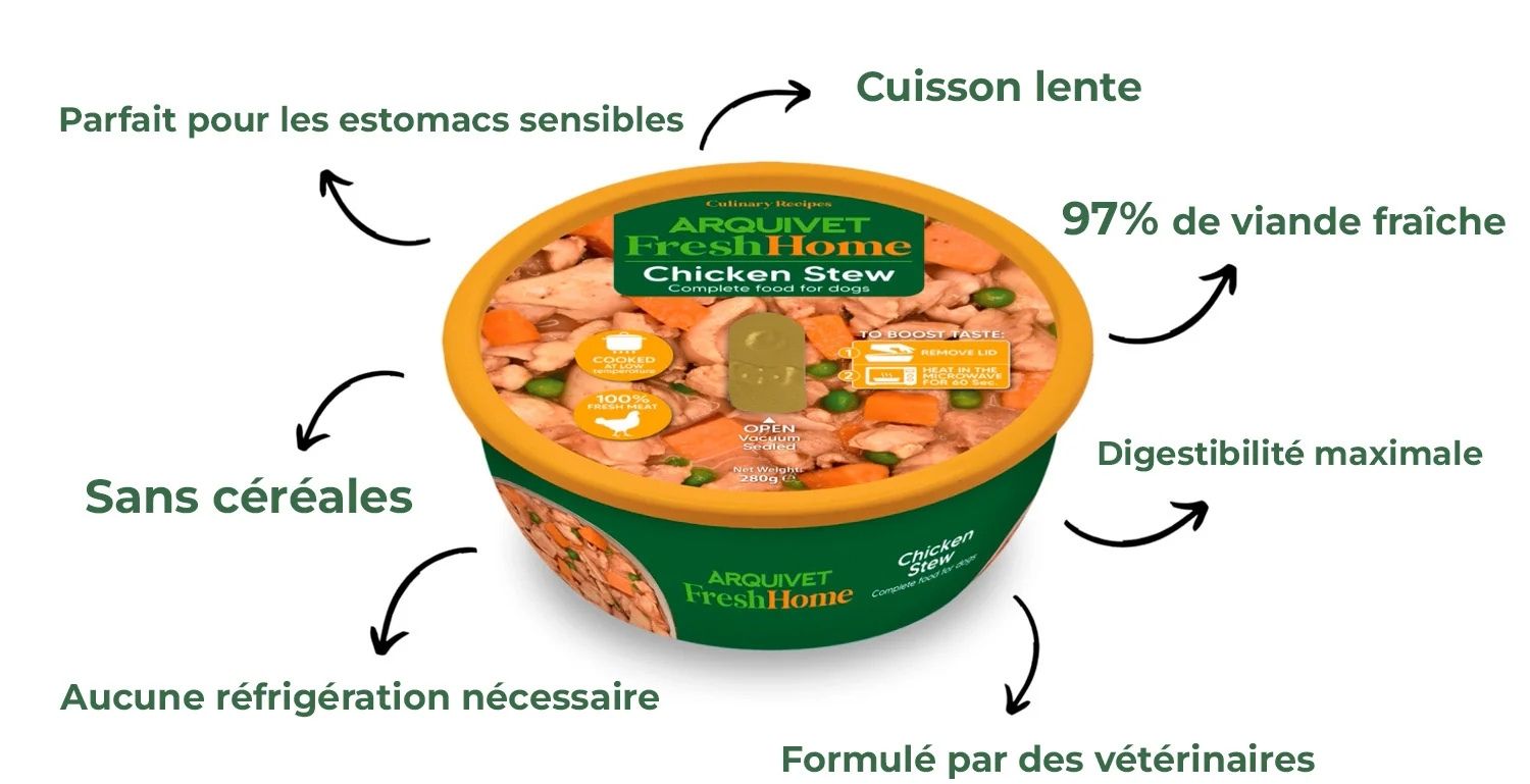 Caractéristiques des plats 100 % naturels FreshHome pour chien marque Arquivet :