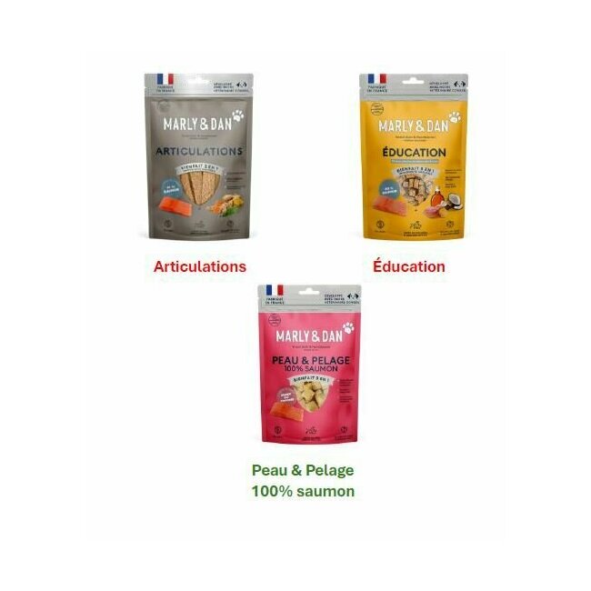 - Education : Nos friandises Éducation pour chien, sans céréales et fabriquées à base de 50 % de saumon, sont enrichies en bétaïne, L-carnitine, L-tryptophane et sirop d’érable. Cette combinaison contribue à soutenir l’énergie, la concentration et l’équilibre émotionnel lors des séances de dressage. Gourmandes et fonctionnelles, elles offrent à votre compagnon une récompense savoureuse qui aide à renforcer le lien éducatif.