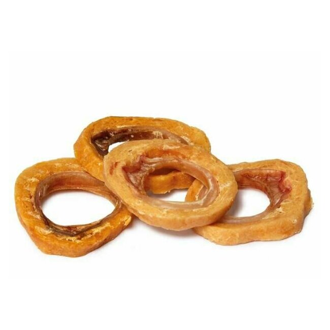 Anneaux de trachée de bœuf au poulet, une friandise 100 % naturelle, idéale pour régaler votre chien et prendre soin de ses dents et de ses gencives. Riche en protéines animales et faible en matières grasses (produit léger). Un aliment complémentaire très riche en nutriments pour votre chien.