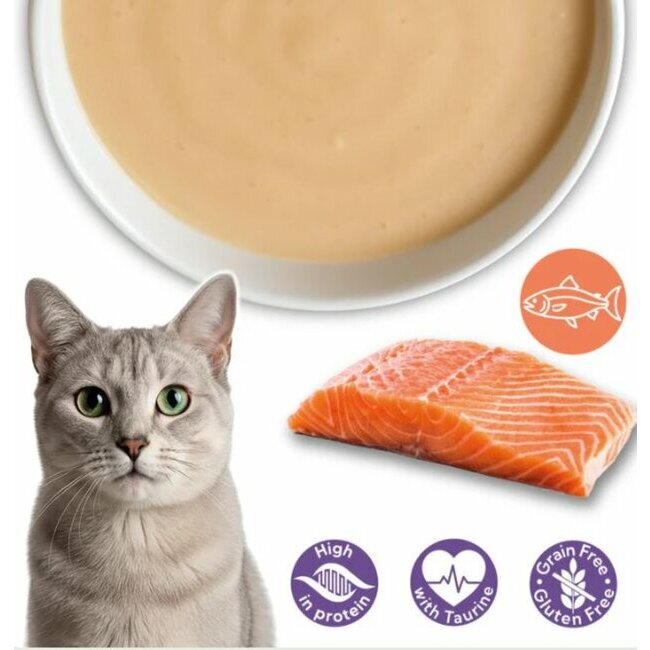 Crème de saumon pour chats, élaborée avec des ingrédients naturels de haute qualité. Un aliment complémentaire, savoureux et nutritif, qui aide à maintenir une bonne hydratation, essentielle au bon fonctionnement des reins. Sans céréales et sans gluten. Un véritable délice que votre chat va adorer.