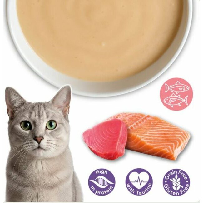 Crème de thon et saumon pour chats, élaborée à partir d'ingrédients naturels de haute qualité. Un aliment complémentaire savoureux et nutritif qui contribue à une bonne hydratation, essentielle au bon fonctionnement des reins. Sans céréales ni gluten. Un véritable délice que votre chat va adorer.
