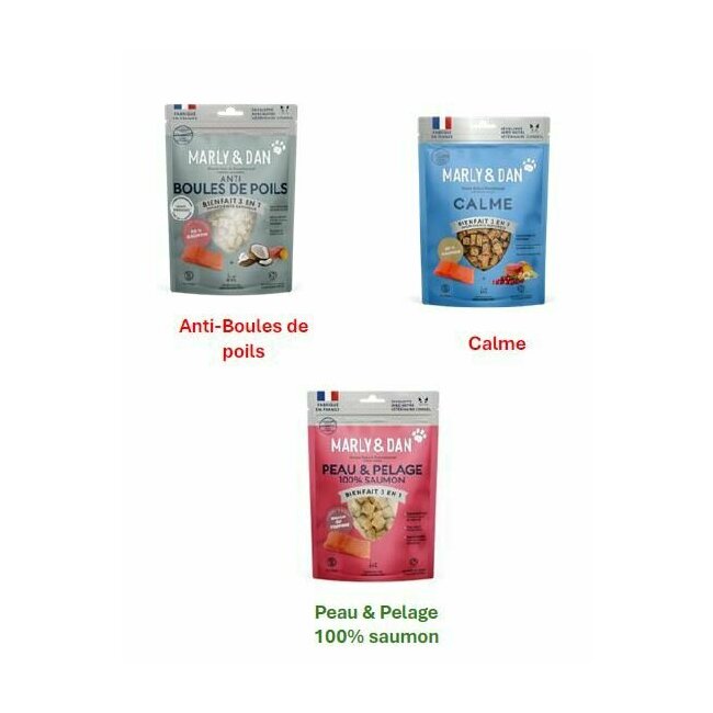 Snacks sains et délicieux pour votre chat. Coffret composé de trois sachets : Anti-Boules de poils, calme et peau et pelage. Chez Marly & Dan, nos friandises pour chat, saines et naturelles, sont pensées pour faire plaisir sans compromis. Formulées à base de saumon frais, elles offrent une source de protéines savoureuses et d’acides gras essentiels. À picorer ou à déguster, elles respectent leur équilibre digestif tout en soutenant leur vitalité et leur bien-être. Un moment de gourmandise... qui fait du bien à votre chat. Boite à friandises offerte.
