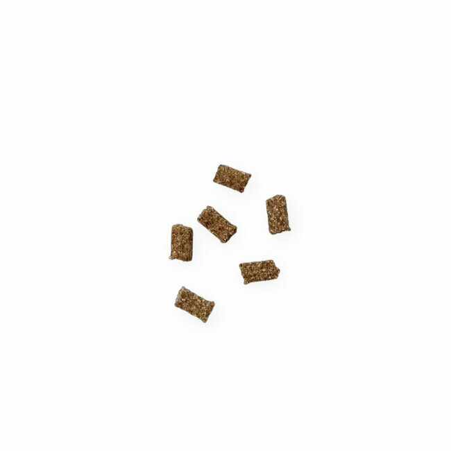 Chair de saumon (45,7%), farine de Noix de coco, Farine de patates douces (13,5% de patates douces séchées équivalent à 52,6 % de patates douces), Levures de bière, Glycérine, Facteurs d’appétence, Huile de colza, Vinaigre de cidre de pomme, fleur de Camomille (0,3 %), poudre de racine de valériane (0,2%), L-Tryptophane (0,1%), Bisulfate de sodium (0,1%), Extrait de Canneberge (0,1%) , Extrait de thé vert .
