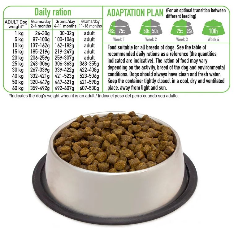 COMPOSANTS ANALYTIQUES: Protéines 29 %, fibres brutes 2 %, matières grasses brutes 18 %, matières inorganiques 7 %, humidité 20 %. Énergie métabolisable/Kg : 3 740 Kcal / 14 165 Kj.