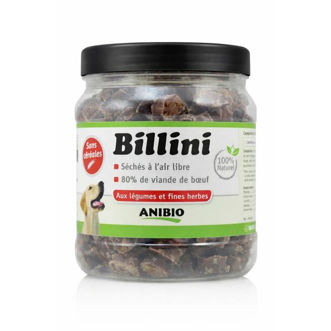 Friandises 100 % naturelles pour chien Anibio à la viande de bœuf, légumes et fines herbes, les billinis sont fabriqués manuellement et sont séchés à l’air libre pendant 4 semaines. Adaptés pour les chiens sensibles et allergiques. D’une grande qualité, ils procurent un excellent moment gustatif à votre chien. Convient en cas d’intolérances alimentaires (sauf allergies au boeuf). Sans sel ajouté. Idéal pour la promenade ou l'éducation.