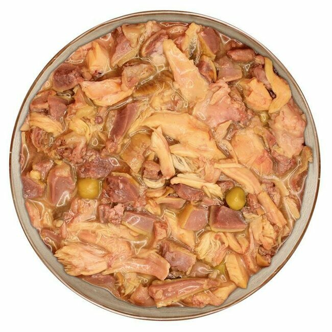 97% de canard frais dans sa sauce, patate douce, petits pois, carotte, persil, curcuma, tomate, épices.