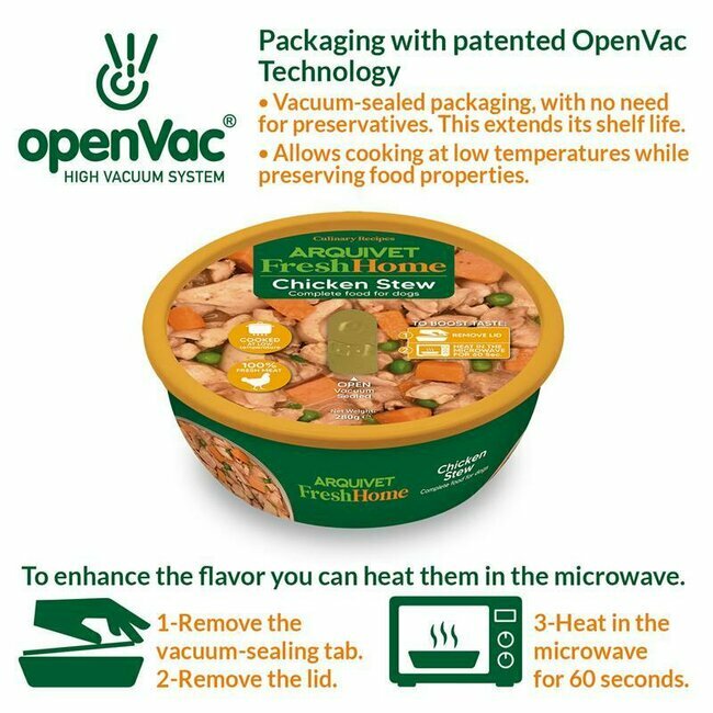 Caractéristiques des plats 100 % naturels FreshHome pour chien marque Arquivet :